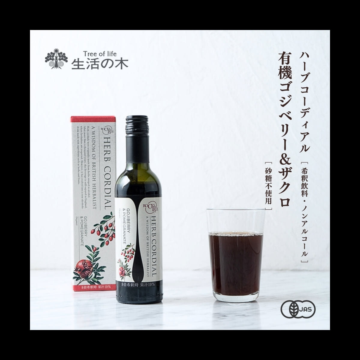 コーディアルは、ハーブや果物をシロップに漬け込んだ、伝統的なノンアルコール濃縮飲料です。1000年以上の時を経て飲み継がれているコーディアルを、生活の木は、おいしさに+話題の素材で進化させています。水、炭酸水、お湯、ハーブティー等で、7~8倍に希釈してお飲みください。ザクロをはじめとした数種の果実と、人気のスーパーフード「ゴジベリー(クコの実)」のジュースを配合しました。砂糖の代わりにアガベシロップで甘みを加えています。