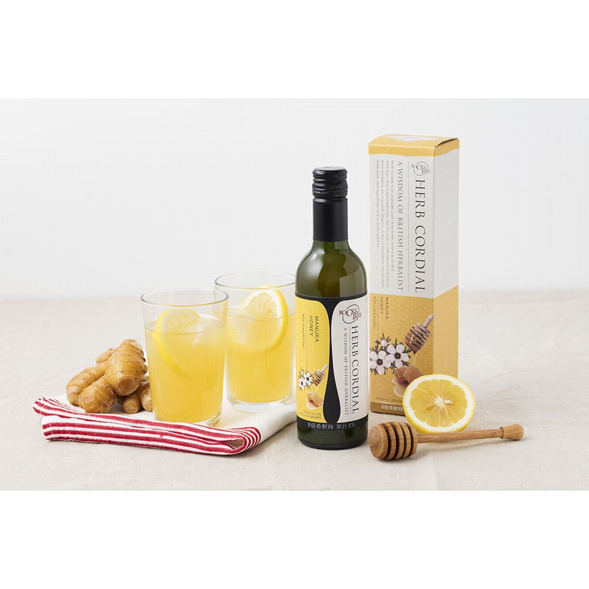 マヌカハニーの香りが楽しめるコーディアルです。味のアクセントにレモンとジンジャーを合わせ、後味すっきりに仕上げました。日々の生活はもちろん、仕事や勉強中、スポーツの水分補給に♪