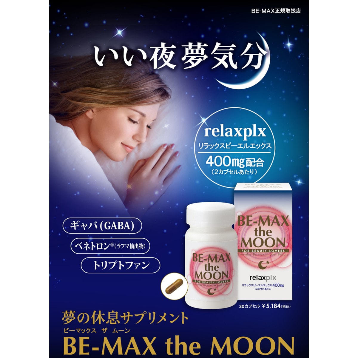 「BE-MAX the MOON」はスペインの研究チームが新たに開発したハーブ「relax plx(リラックスピーエルエックス)」を中心に、GABA・ベネトロン®・トリプトファン・ビタミンB12・ナイアシンを配合しています。