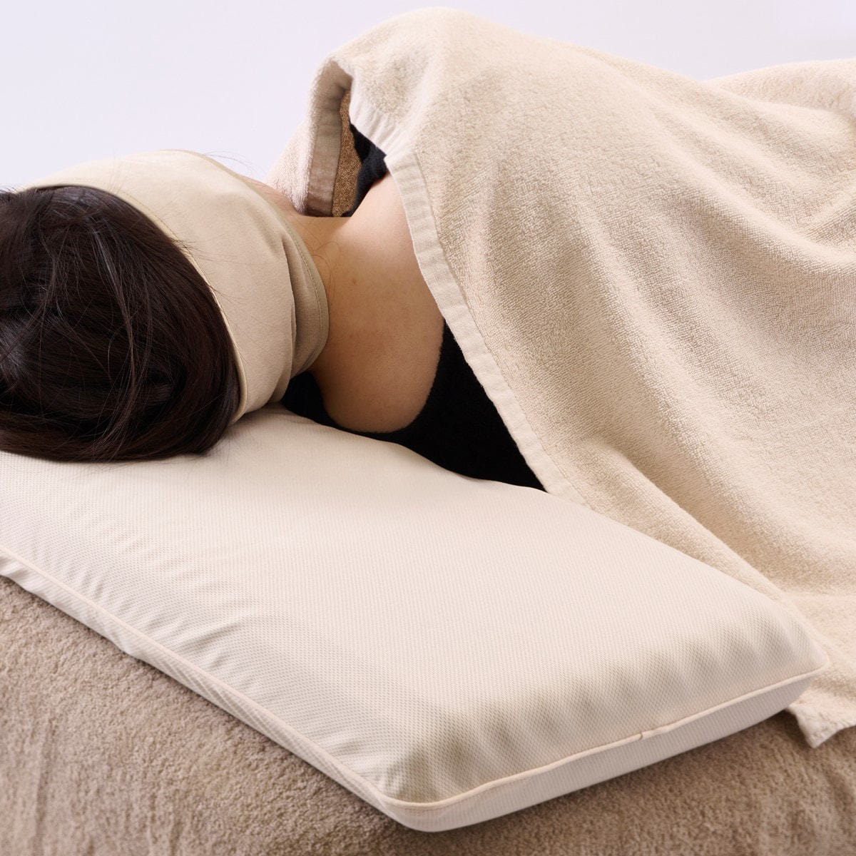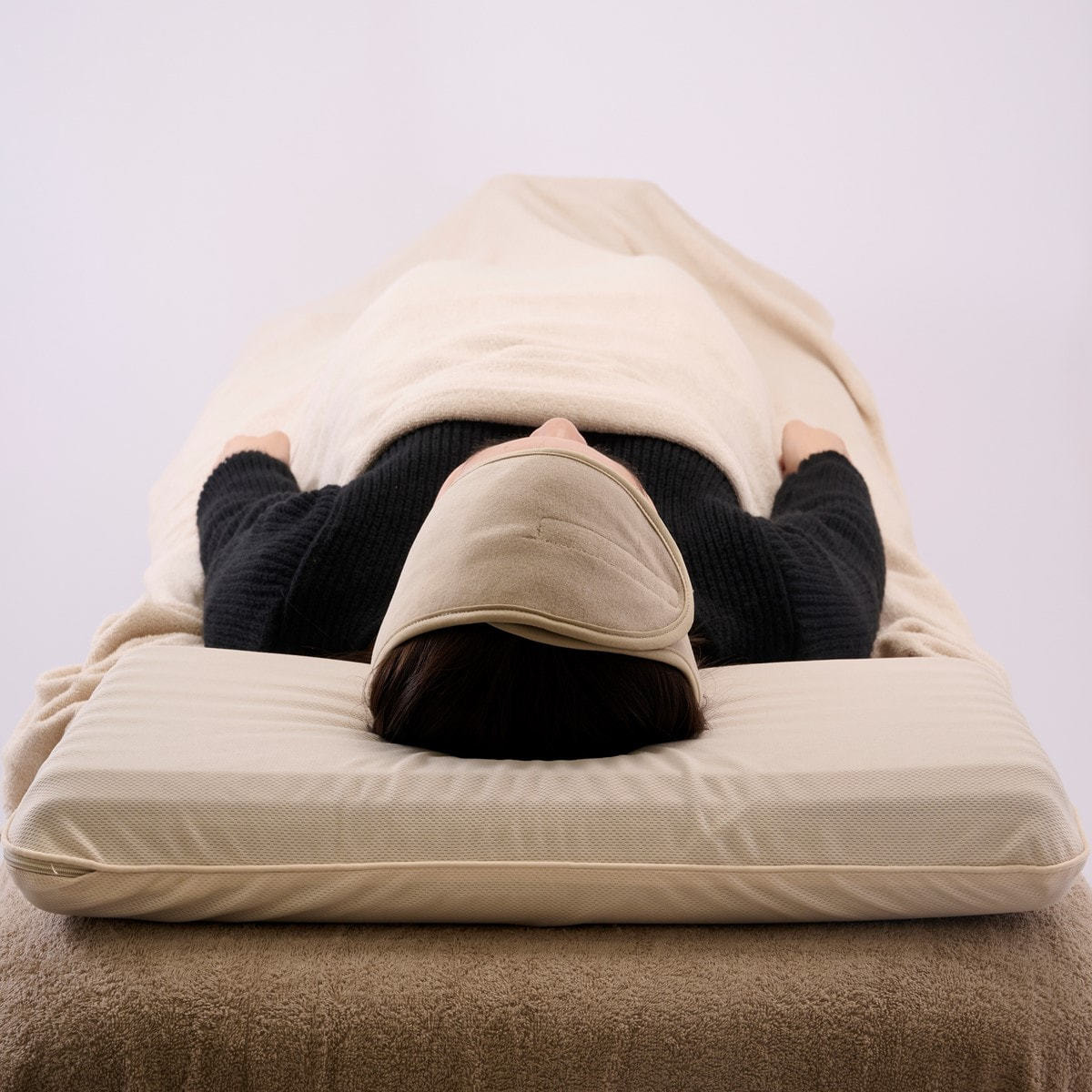 フェイシャル施術など仰向けのときは、くぼんでいる部分に頭をのせ、横向き姿勢の施術時は、まくら左右の両端部分に頭をのせていただけます。